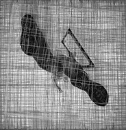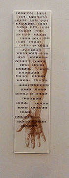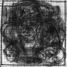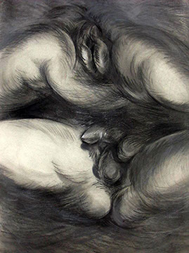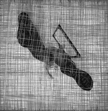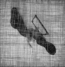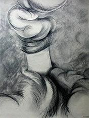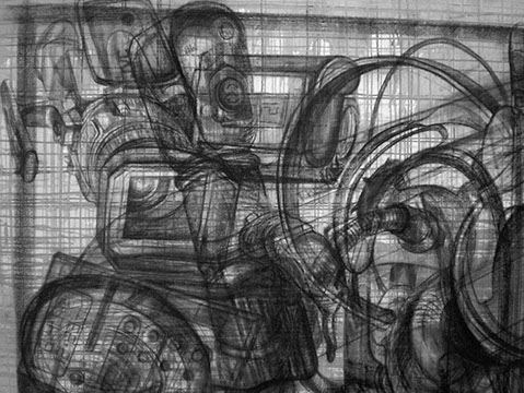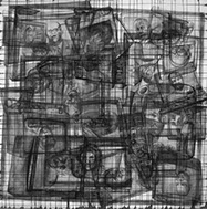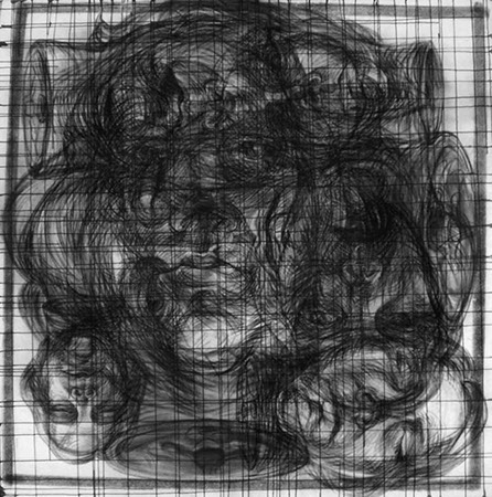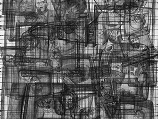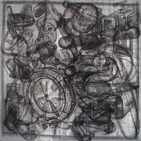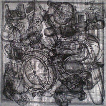 En oposición a este procedimiento presento dos piezas, (“Vanitas” y “Repolitización”) que intentan también, dislocar la lógica habitual propia del afán de reproducción mecánica de las imágenes, pero sin hacer uso de la borrosidad catabólica que origina la aglomeración indiscriminada de elementos. En estos casos la resultante visual difiere del resto de los dibujos, al aparecer un motivo único, el cual sintetiza en su concepto la dificultad de la búsqueda de sentido. El reverso de un bastidor de pintura y la contracción proyectiva propia del escorzo implican igualmente ocultamiento y confusión y evidencian el intento de cuestionar la situación espacial del que observa.