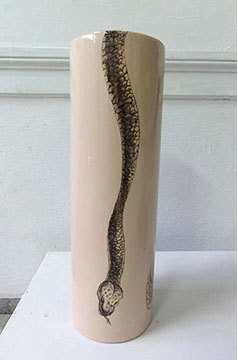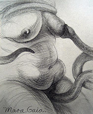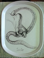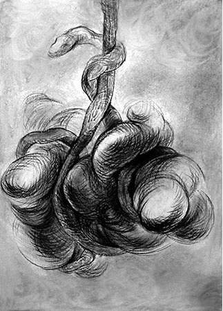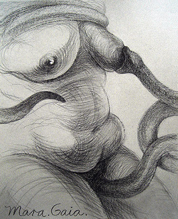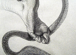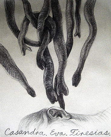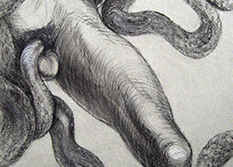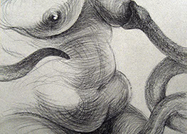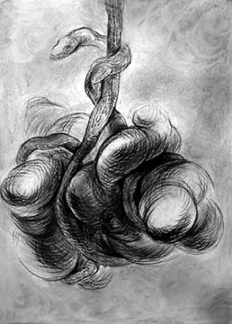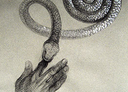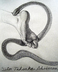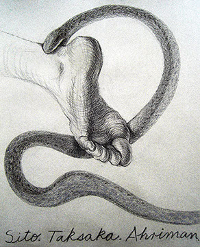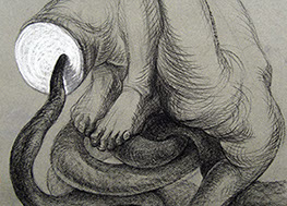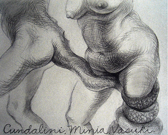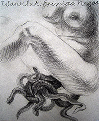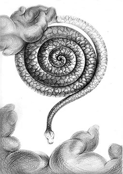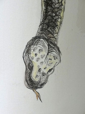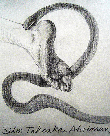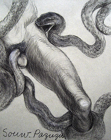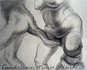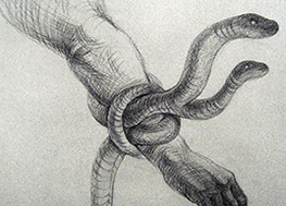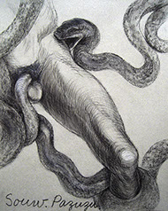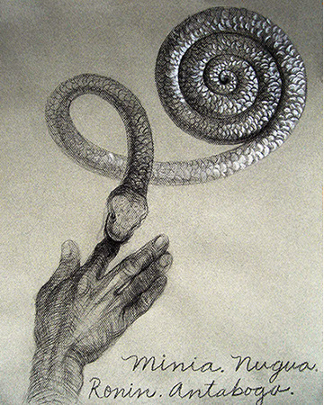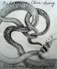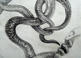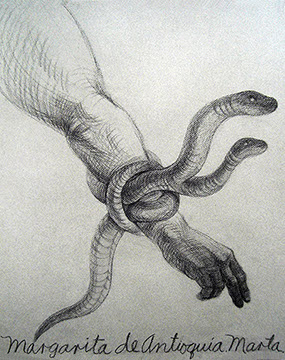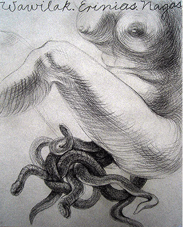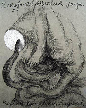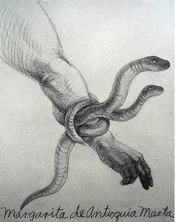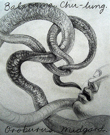 A primera vista se pueden entender los dibujos como una especie de escolio adjunto a la pieza central o su dimensión anecdótica, suscrita a una estética más “digerible”. Pero una segunda mirada devela la utilización de redoblamientos figurativos, la mezcla arbitraria y caprichosa de mitos e historias relacionadas con ofidios de los más diversos orígenes, con el fin de “desdibujar” los límites entre entidades perfectamente establecidas y delimitadas histórica y culturalmente. Este procedimiento se apoya en el uso de un complemento textual en los dibujos, que enumera indistintamente nombres de personajes o deidades, sin distinción, ni orden, respetándose únicamente la similitud temática. El texto ilustra la imagen, le aporta nuevas dimensiones, multiplica su significado hasta lo confuso.