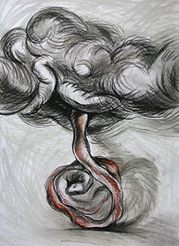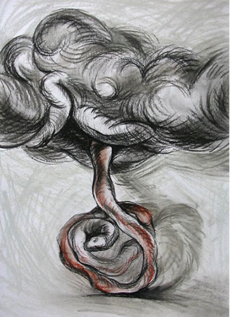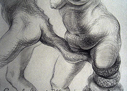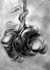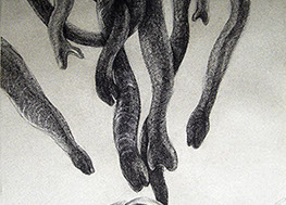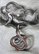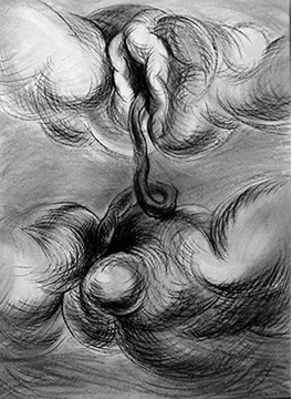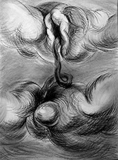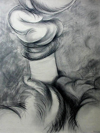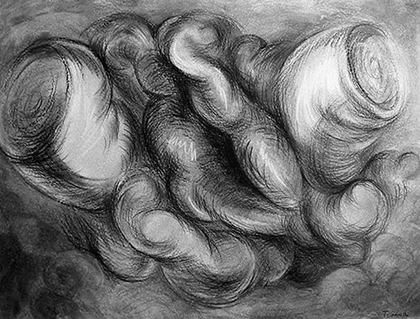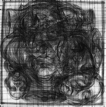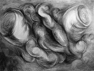 El cuestionamiento de un arte ingenuamente morfológico resulta el detonante para abordar aspectos temáticos: el sentido de la creación artística en relación con el mundo trascendente y material, así como lo inconexo y fragmentario que pueden resultar la aprehensión de la realidad y su representación en el arte. Aquí se genera “el circulo vicioso” alrededor del cual concibo estos dibujos. Para enfrentarlo me he autoimpuesto un ejercicio artístico, que persigue sabotear la representación desde dentro, negando insistentemente la afirmación sígnica, mediante el traslapo de las formas, tanto en el propio procedimiento plástico como a nivel simbólico.