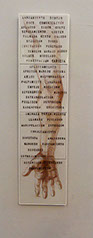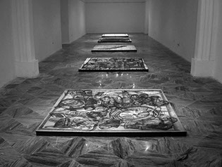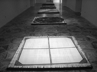 La elección de formatos cuadrados, expuestos sobre el piso, me permite disponer de un espacio relativamente neutral, donde las coordenadas espaciales de arriba-abajo y derecha-izquierda del formato quedan a merced de la ubicación del que observa. ¡Cualquier punto de vista resulta igualmente válido!... (ahora sí me he quedado “en blanco”).